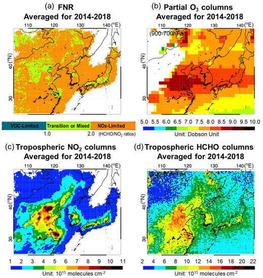 Spatial distributions of (a) satellite-derived FNR and Ozone Monitoring Instrument (OMI) satellite measurements of the (b) lower tropospheric (900–700 hPa) O3 partial column, (c) tropospheric NO2 column, and (d) tropospheric HCHO column in East Asia averaged for 2014–2018.