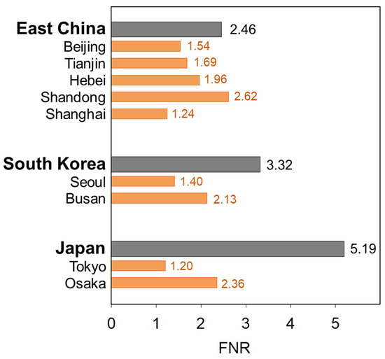 Five-year (2014–2018) average FNRs for East China, South Korea, and Japan, and the nine megacities.