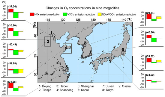 However, there are still many uncertainties in modeling studies, and more reliable adequacy of control strategies would be guaranteed under the premise of more reliable emission input data and model validation. However, other megacities, except for the above-mentioned four cities, i.e., TJ, HB, SD, and OS, showed that O3 decreased by −1.4%, −4.6%, −11.5%, and −1.3%, respectively, clearly indicating that the VOC-reduction case (EXP2) showed an O3 decrease efficiency by more than twice compared to both reduction cases (EXP3). Therefore, an immediate or short-term O3 abatement policy can be developed until the time when long-term significant changes in FNR are evidenced in East Asia.