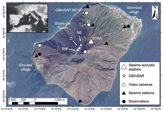 - Di Traglia, F.; Nolesini, T.; Intrieri, E.; Mugnai, F.; Leva, D.; Rosi, M.; Casagli, N. Review of ten years of volcano deformations recorded by the ground-based InSAR monitoring system at Stromboli volcano: A tool to mitigate volcano flank dynamics and intense volcanic activity. Earth Sci. Rev. 2014, 139, 317–335. [Google Scholar] [CrossRef]