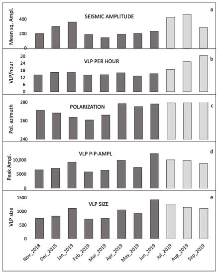 Monthly histograms from November 2018 to September 2019 of the raw seismic signal amplitude recorded by the STRA station (a); hourly occurrence of VLPs (b); polarization azimuth of the raw signal of the STRA station (c); peak-to-peak amplitude of VLP events (0.05–0.5 Hz) recorded by the STRA station, horizontal component (d); VLP size measured by the STRA station, horizontal component (e). The dark gray bars are relevant for the period before the paroxysm of 3 July 2019, the light gray bars are relevant for the period following the aforementioned paroxysm.