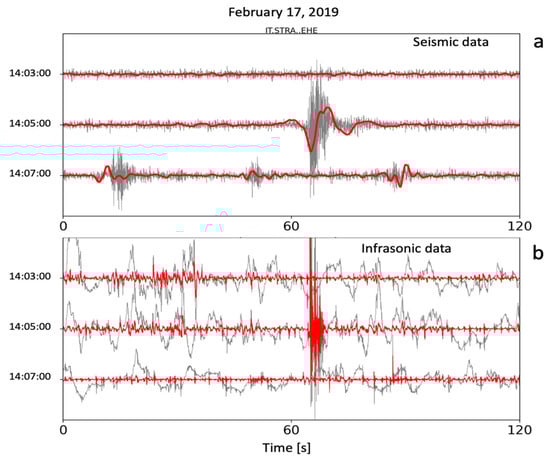 Example of seismic (a) and infrasonic (b) signals of a single explosion that occurred on 17 February 2019 at 14:05 UTC. The raw signals are shown in gray. In red, the seismic signal filtered in the VLP band (0.05–0.5 Hz) in panel (a) and the high-pass filtered infrasonic signal (>0.5 Hz) in panel (b).