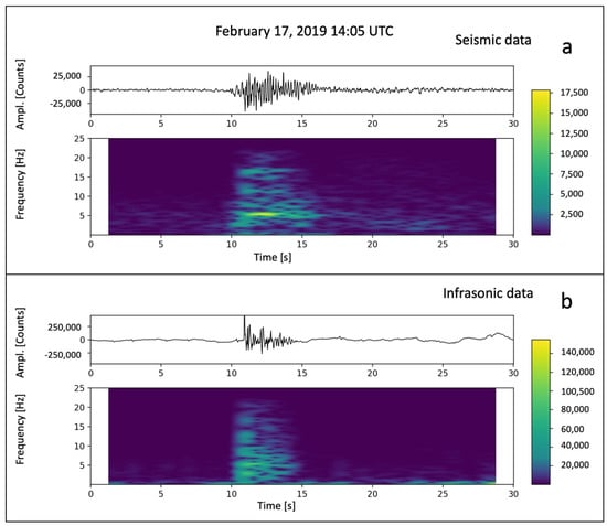 Example of the seismic (panel a) and infrasonic (panel b) signals of an explosion that occurred on 17 February 2019 at 14:05 UTC. The raw signals and the spectrograms for both signals are shown.