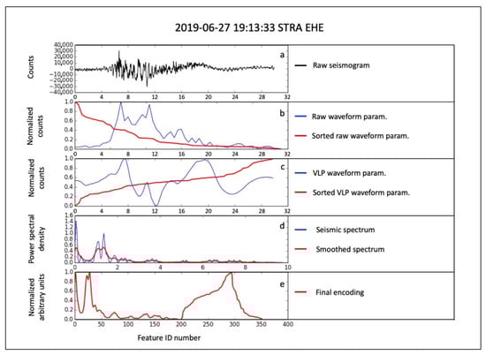 An efficient feature extraction method for seismic data typically takes into account the spectral content and the waveform of the events (e.g., [,,]). Actually, these are the characteristics that the analysts visually examine to classify seismograms, for example, to distinguish a local earthquake from a regional one or a teleseism. Often, spectrograms expressed in compressed form and waveform functions calculated on sliding windows [] are used to analyze events with impulsive onset. However, in this case, the signals of our interest are the VLPs (0.05–0.5 Hz) in which an impulsive onset cannot be recognized. Thus, we designed novel methods for seismic and infrasonic feature extraction, that are independent of the picking of a transient signal onset. The method for cutting data, which allows us to extract event records from the continuous signal, relies on an algorithm designed to detect the VLP event with the largest “size” in half-hour windows []. This algorithm allows cutting a 30 s signal interval from each half-hour window, but it does not return signal intervals starting precisely at the picking of a signal onset. For this reason, to encode the VLP event waveforms, we sorted the amplitude features in ascending order and, to encode the seismic signal frequency content, we used the spectrum, and not the spectrogram (Figure 5). In particular, by using the utilities of ObsPy Toolbox [], we calculated the spectrum of every selected 30 s signal, then we applied a filter for smoothing the obtained spectrum, using the aforementioned ObsPy Toolbox, and, finally, we downsampled the smoothed spectrum by a factor of 1:3 (Figure 5d). Moreover, we encoded the VLP event waveforms by filtering the signal in the 0.05–0.5 Hz band, resampling it by a factor 1:16, and sorting the values of the filtered and resampled seismogram in ascending order (Figure 5c). We added the information of the raw seismic signal waveform using an encoding based on the peak-to-peak amplitude of a 25-sample (0.5 s) sliding window. This waveform parameterization is performed by applying the following equation: