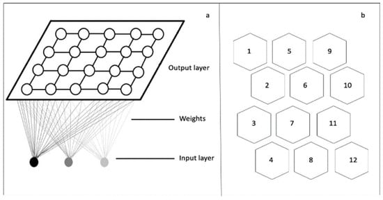 In our work, we used a SOM with a 3 × 4 = 12 local hexagonal grid (Figure 6b), and a global toroid shape displayed as a sheet to have an immediate visual cluster configuration. This means that nodes on top and bottom are neighbors as well, as are the side nodes. Figure 6b also shows the numbering of the map nodes which proceeds from top to bottom and from left to right. Finally, we fixed the SOM parameters according to Kohonen et al. [] and the SOM toolbox for Matlab (http://www.cis.hut.fi/somtoolbox/, last accessed 4 March 2022).