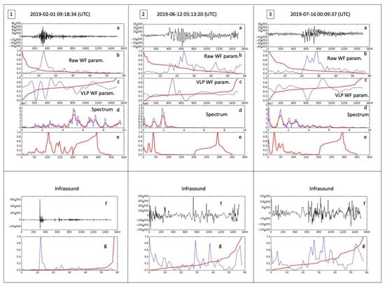 Parameterization of seismic and infrasound signals of three explosive events that occurred on 1 February 2019 (1), 12 June 2019 (2) and 16 July 2019 (3). In the three panels (1, 2 and 3): (a) The raw seismic data. (b) The waveform parameterization of the raw seismic data (blue line) and the same curve sorted in descending order (red line). (c) The seismic signal filtered in the VLP frequency band (0.05–05 Hz), resampled (blue line) and rearranged in ascending order (red line). (d) The spectrum up to the frequency of 10 Hz (blue line) and the smoothed and resampled spectrum (red line). (e) The vector of the features that encode the seismic signals given by the union of the red vectors of (d,c,b). At the bottom of the figure the signals (f panels) and the waveform parameterization (g panels) of the infrasonic data are shown. On the horizontal axes of panels (a,c,f) there is the sequential index of the sample; on the horizontal axes of panels (b,g) the sequential index of the peak-to-peak amplitude values is reported; on the horizontal axis of the panel (d) the frequency in Hz is reported; on the horizontal axis of the panel (e) there is the feature numbering.