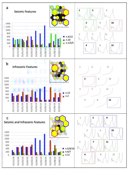 We carried out three clustering experiments through the SOM analysis: (i) using only the seismic features; (ii) using only the infrasonic features; (iii) using both features of seismic and infrasonic data. Figure 8 shows the results of the three experiments. In the SOM maps, each node is shown as a yellow hexagon, whose size indicates the node density, in terms of the number of input samples associated with that node. The Euclidean distance between the prototypes of two neighboring nodes is represented according to grayscale in the spaces between the nodes. Dark gray hexagons interposed between the nodes correspond to a great distance, light gray indicates high similarity between the prototypes of neighboring nodes. We indicated the nodes of the SOM map with progressive numbers from 1 to 12 (the dimensions of the map are 3 × 4). The node numbering criterion is shown in Figure 6b.