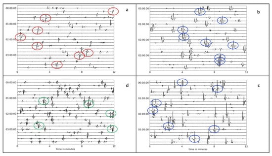 The first 4 h (UTC time) of the seismogram (east–west STRA channel) filtered in the VLP frequency band (0.05–0.5 Hz) of four of the five sample days representative of the main SOM nodes. (a) 2019-02-17, the red ovals mark the events belonging to node 4 (Red cluster). (b) 2019-05-16, the blue ovals mark the events belonging to node 9 (Blue cluster). (c) 2019-06-08, the blue ovals mark the events belonging to node 10 (Blue cluster). (d) 2019-08-06, the green ovals mark the events belonging to node 11 (Green cluster).