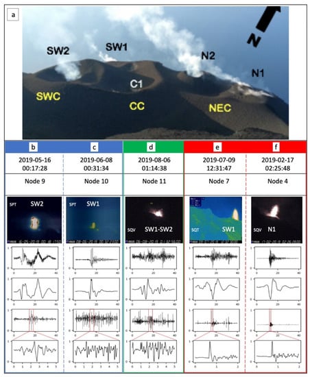 Figure 10 shows an example for each of the main nodes belonging to one of the three clusters. In particular, panels (b) to (f) show the images and the seismo-acoustic recordings of the event types for nodes 9 and 10 (cluster Blue), node 11 (cluster Green), and nodes 4 and 7 (cluster Red). For each of them, the date, the node they belong to, the image of one of the cameras used for the analysis, the raw seismic signal, the seismic signal filtered in the VLP band (0.05–0.5 Hz), the high-pass filtered infrasonic signal (>0.5 Hz), and a zoomed-in view of the infrasonic signal are shown from top to bottom. The SPV and SPT cameras are very close to the vents whereas the SQV and SQT cameras are further away from them (Figure 1 and Figure 10a), therefore the explosions that produce a weak signal in the camera recordings (e.g., panels b and c) are visible only from the cameras installed at site P in Figure 1 (SPV and SPT). Figure 10b,c represents two event types of cluster Blue, which is associated with gas explosions, belonging to nodes 9 and 10, respectively. The events of this cluster show VLPs (Figure 9b,c) characterized by prolonged oscillation, especially evident in the events falling into node 9, and peak-to-peak amplitude generally higher than that of the events belonging to the other two clusters (particularly evident in node 10). The infrasonic signal associated with these events is almost indistinguishable from the background noise. Figure 10d shows an example of cluster Green, consisting of only node 11, which groups explosions with ballistic spatters and hemispherical shapes. The raw seismic signal associated with this explosion is modest in amplitude whereas the sustained VLP signal includes numerous oscillations. The infrasonic signal does not show an evident pulse linked to the explosion and is characterized by repeated minor pulses linked to spattering activities. Finally, Figure 10e,f represents two event types of cluster Red, falling on nodes 4 and 7, respectively. These events are characterized by a VLP signal with a distinct amplitude pulse and an infrasonic transient of remarkable amplitude. The raw seismic signal shows a greater contribution of the high-frequency components compared to the other types of events, in part due to the coupling of the infrasonic signal with the ground []. These seismo-acoustic events are associated with explosions that produce a well-collimated jet, with ejection of ballistic fragments as described above for the events of cluster Red.