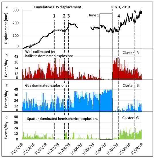 By comparing this displacement data with SOM clusters and then with the camera images, we found that the period dominated by the gas explosions of cluster Blue (Figure 11c), which begins in early April (the predominance of cluster Blue is highest in June 2019, as shown by the black rectangle in Figure 11), occurs during a stasis of ground deformation interposed between two phases of inflation of the upper part of the volcanic edifice (Figure 11a). On the contrary, the explosions of clusters Red and Green (Figure 11b,d), that are dominated by the ejection of coarse juvenile ballistic particles, occur in periods characterized by inflation of the crater area. In particular, cluster Green, erupting large spatter, seems temporally correlated with the phases of more intense inflation of the top of the volcano.