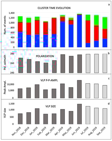 Comparison between: (a) seismo-acoustic clusters obtained with SOM analysis, (b) polarization of the seismic signal, (c) peak-to-peak amplitude of VLP events, (d) VLP size. The parameters shown in panels (b–d) were calculated in Giudicepietro et al. []. The dark gray bars are relevant for the period before the paroxysm of 3 July 2019 whereas the light gray bars are relevant for the period following that paroxysm.