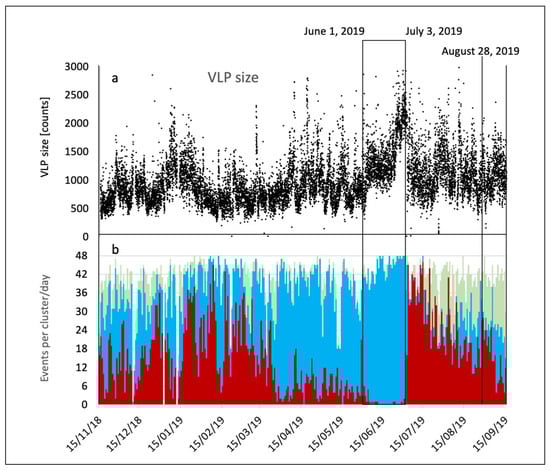 The time evolution of the VLP size parameter (a) and seismo-acoustic clusters (b). Relative daily occurrence of the three seismo-acoustic clusters (Red, Blue, and Green) contains one event per half hour of signal, so the maximum number of events in a day is 48. The black rectangle indicates the interval between 1 June 2019 and 3 July 2019 when the paroxysm occurred. The vertical black line indicates the 28 August 2019 paroxysm.