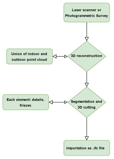 In the proposed experiment, the logic procedure we used in the HBIM building differs from that available in the literature, allowing one to better define the recognition of various “faults” (which distinguish a specific cultural heritage object, ensuring its perfect reproduction and digital survival) but are overall a bit slow and cumbersome and sometimes cause problems regarding interchanging formats.