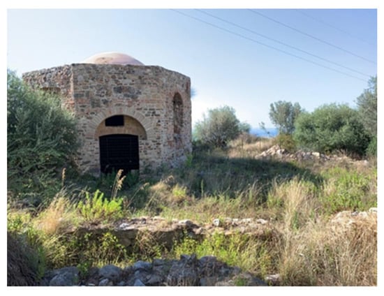 Of the sacred complex (Basilian Monastery), which rests or reuses previous structures, there remains a singular octagonal plan structure covered by a hemispherical dome (San Pietro di Deca in the official toponymy and “Conventazzo” in the demotic of the place), whose original construction precedes that of the Basilian monastery. The basic term is convent (cum coming − cum ventum = meeting), with an augmentative alternative suffix. Probably, the literary alteration intends to express the idea of decay, representing the state that the factory was in. Obviously, the term cannot refer only to the “baptistery” but clearly also refers to the entire architectural compendium, abbey and baptistery. All the scholars who have dealt with the Conventazzo unanimously date its origins to the late ancient age (4th/5th century AD) and see its original function either as a commemorative monument (cenotaph) or, less likely, as a part of a spa complex. The Christian use, possibly, but not yet proven, as a baptistery, took over at a later time; however, it was durable and effectively guaranteed the survival of the building. In fact, it was incorporated, around 1100, into the now disappeared monastic complex of San Pietro di Deca, to whose existence its traditional name, Conventazzo, precisely refers (Figure 3).