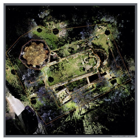 Later, a Faro 3D X130 laser scanner and the commercial program FARO scene v.4.1 were used. Software [11,12] was used for the survey of the interior and exterior in classic mode. Then, we proceeded to integrate the point clouds acquired externally and internally by the laser scanner, obtaining the image in Figure 5 overall of the whole area.