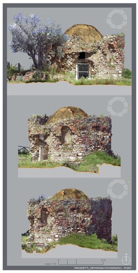 Table 1 demonstrates comparisons (ΔRP ΔRL) and precision between real measurements (R) of various elevations (L) and heights (H) of the Conventazzo and measurements derived from the 3D models created with photogrammetry and laser scanners. The difference in measurements and relative accuracy, as expected, highlights the greater dependability of the laser scanner technique. Therefore, in the following phases, leaving aside the point cloud derived from the drone, the point cloud derived from the laser scanner was employed.