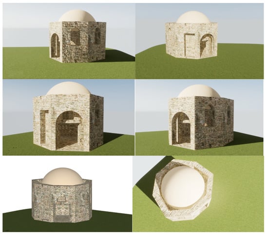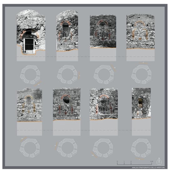 The morphotypological reconstruction of the BIM is fundamental; thanks to the experimental methodology used, and having a huge amount of information available in a single digital model (HBIM in Figure 12), as well as all the information acquired during the survey campaign, it is possible to study the morpho-typological evolutions of the building (Figure 15) without the need to carry out subsequent survey campaigns. Of great importance is the method of segmentation and classification used (Figure 10) to construct the BIM because it allows us to analyze complex details that would not otherwise emerge from a normal survey (Figure 13).