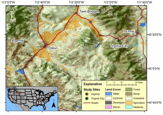 Locations of the Argenta and Virginia City, Montana, study sites where unpiloted aerial vehicle (UAV) flights were conducted over the growing season of 2018. Land cover data from the 2016 National Land Cover Dataset (MLRC.gov accessed on 1 December 2021).