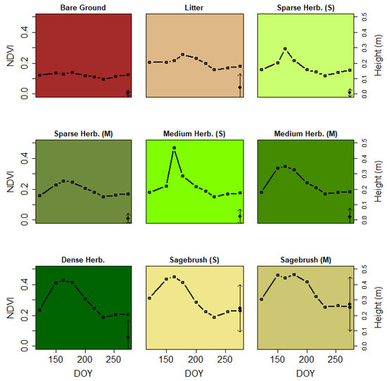 Mean normalized difference vegetation index (NDVI) values by day of the year (DOY) for the nine vegetation classes produced through an iterative self-organized (ISO) unsupervised classification of imagery from nine unpiloted aerial vehicle (UAV) flights at the Argenta site in 2018. Dots and arrows at flight date 274 represent the class mean vegetation height and one standard deviation. Colors are assigned to match Figure 2. Herb—herbaceous, S—short duration growing season, and M—moderate duration growing season.
