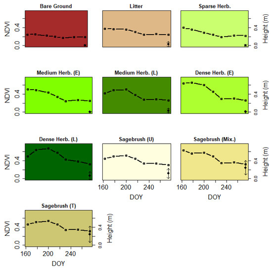 Mean normalized difference vegetation index (NDVI) values by day of the year (DOY) for the 10 classes produced through an iterative self-organized (ISO) unsupervised classification of imagery from 7 unpiloted aerial vehicle (UAV) flights at the Virginia City site in 2018. Dots and arrows at flight date 274 represent the class mean vegetation height and one standard deviation. Colors are assigned to match Figure 2. Herb—herbaceous, E—early green-up, L—later green-up, U—short (generally upslope), T—tall, Mix—mixed herbaceous and sagebrush.