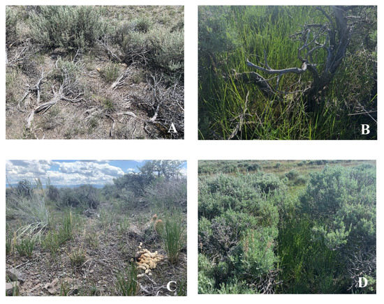 We selected two rangeland sites in southwestern Montana (Mont.), U.S.A., to capture two levels of precipitation of shrub-grassland sites in the region (Figure 1). Argenta, a drier and lower-elevation site, is located 20 km west of Dillon, Mont., in upland sagebrush steppe with primarily alluvial alfisols, sandy-loam soils, at approximately 1900 m elevation [74]. Mean monthly temperatures range from −7.3 to 16.4 °C with annual average precipitation of 283 mm (PRISM Climate Group, Oregon State University, http://prism.oregonstate.edu, created July 2012, accessed on 12 December 2019) [75]. The wetter, cooler, and higher elevation Virginia City site is located 5 km east of Virginia City, Mont., at an elevation of approximately 2240 m. Mean monthly temperatures range from −6.9 to 14.6 °C with annual average precipitation of 588 mm (PRISM Climate Group, Oregon State University, http://prism.oregonstate.edu, created July 2012, accessed on 12 December 2019) [75]. Soils are primarily mollisols with a mix of gravelly loam and stony loam on the steeper slopes [74]. Both sites are composed of sagebrush steppe; however, Virginia City generally has taller sagebrush, denser grasses, and less bare ground than Argenta.