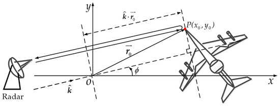 After translational motion of target compensation, the model can be simplified to a classic turntable model. When the target is in uniform motion status and the coherent processing interval (CPI) is short, the target motion can be equivalent as uniform rotation. Here, we take the monostatic radar as an example. Taking the origin as the phase center and a point scatterer is situated on the target, as shown in Figure 1.