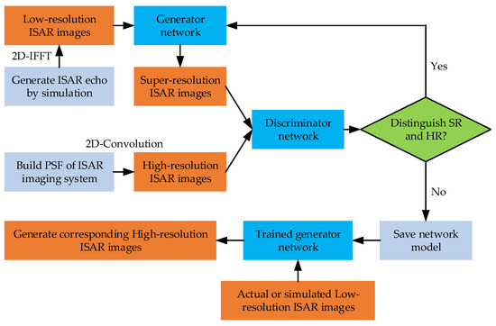 The GAN has a powerful processing capacity to improve the resolution of the ISAR images. The main mechanism lies in its strong end-to-end mapping learning ability, which reconstructs high-resolution (HR) images using low-resolution (LR) images by supervised learning. According to Equation (7), LR ISAR images can be obtained by taking the Inverse fast Fourier transform (IFFT) to the radar echo, while the HR ISAR images can be acquired by the convolution between target scattering function and PSF of HR ISAR system in Equation (8). The framework of the proposed GAN is shown in Figure 2.
