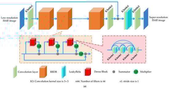 For ISAR images, they do not have rich edges and color information like optical images. The most prominent feature of ISAR images is image contrast, which is displayed in the form of bright spots. Skip connections in the residual network (Res-Net) can preserve the image contrast [16], so we take Res-Net as the basic structure of . Inspired by [20], the architecture of is shown in Figure 3a. To improve the detailed expression ability of recovered ISAR images, the Residual-in-Residual Dense Block (RRDB) is adopted in the generator network. RRDB contains multi-level residual network and dense connections, which can describe the weak scatterers of ISAR images accurately and improve performance. Here, each RRDB contains three dense blocks and the number of RRDB is 11. A dense block is composed of four convolution layers and three leaky rectified linear unit (LeakyRelu) layers. The convolution layer consists of kernels and 64 feature maps with stride 1 [20], which can improve network performance. Also, batch normalization (BN) layers in dense blocks are removed [23]. Besides, is residual scaling to prevent instability and the value of is 0.2. Different from the image super-resolution task, our training data, namely HR images and LR images, have the same size. And LR images are not obtained by down sampling in the data generation stage. So, the up-sampling module is cancelled to fit our task. The final convolution layer contains three output channels.