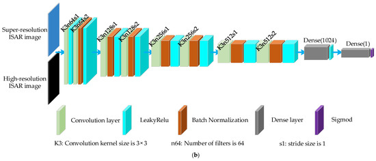The architecture of the proposed GAN for ISAR resolution enhancement: (a) the structure diagram of generator network; (b) the structure diagram of discriminator network.