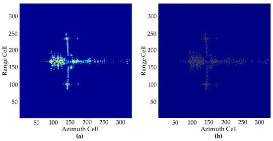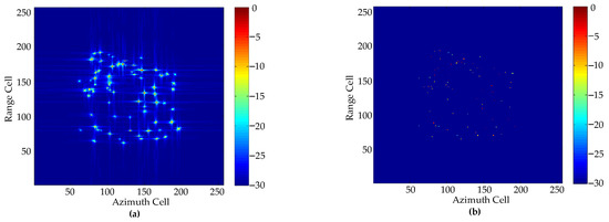 Since the non-cooperative targets can always be regarded as a combination of scattering points, the sparse reconstruction algorithms based on compressive sensing (CS) are used to handle the imaging problems, which have attracted the attention of many scholars in recent years [3,4,5]. The echo received by ISAR physically has the sparsity characteristic. So, the CS method is very suitable for ISAR imaging with sparse aperture (SA). Many well-known CS algorithms have been applied to ISAR imaging, such as the orthogonal matching pursuit (OMP) algorithm [6], smoothed -norm (SL0) algorithm [7], fast iterative shrinkage-thresholding algorithm (FISTA) [8], alternating direction method of multipliers (ADMM) [9], and so on. These CS methods obtain the high-resolution ISAR images by the -norm or -norm optimization. Compared with traditional ways, the CS method has better resolution performance on ISAR images. However, the image quality obtained by the CS method is limited by the sparse observation model and it will inevitably produce some fake points if the model is not accurate, which will affect the resolution performance. In addition, the computational complexity of the CS method is high, which results in the time consumption of the CS method being too long to realize real-time imaging.