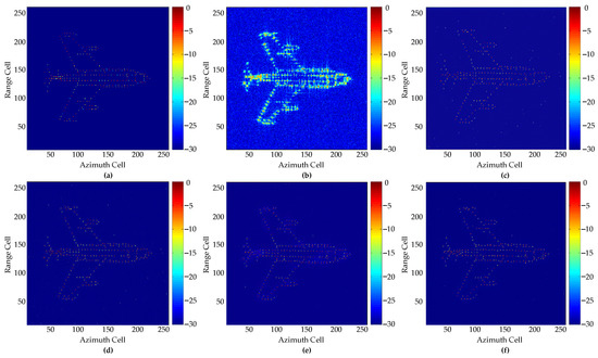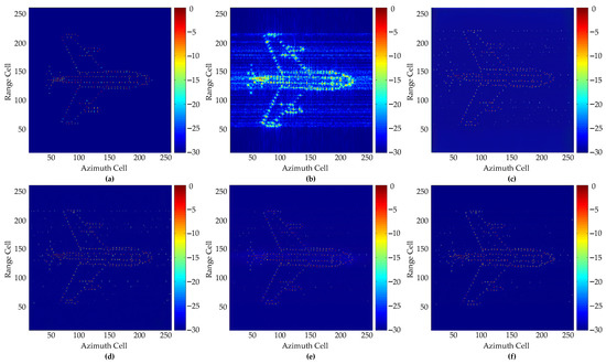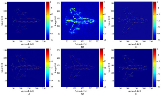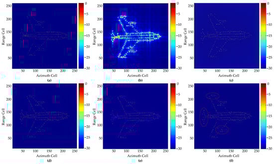 Imaging results of simulated aircraft at SNR = −4 dB: (a) Ground truth; (b) IFFT; (c) GAN1; (d) GAN2; (e) GAN3; (f) Proposed GAN.