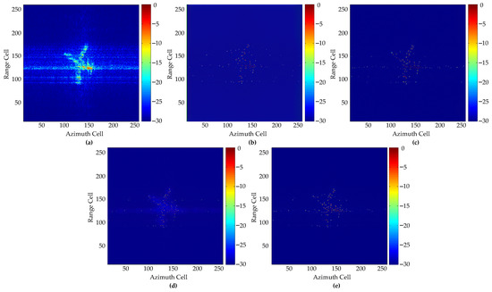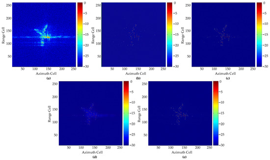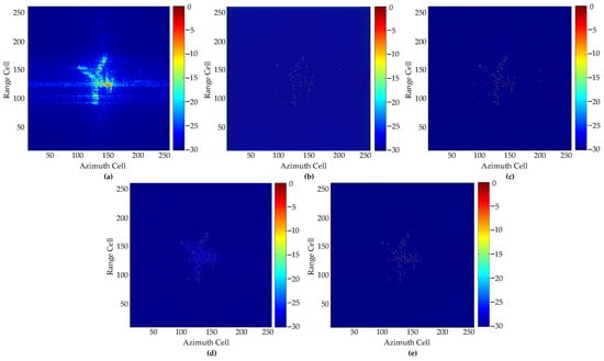 Imaging results of Yak42 at SNR = −4 dB: (a) IFFT; (b) GAN1; (c) GAN2; (d) GAN3; (e) Proposed GAN.