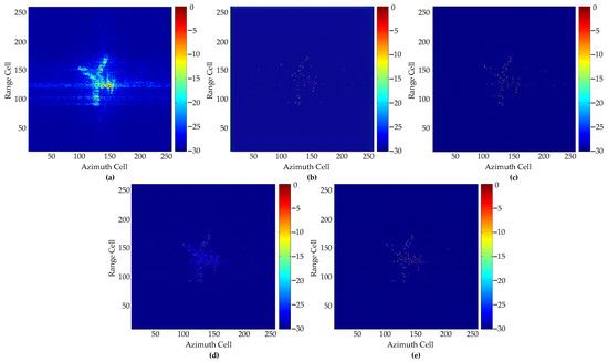 The imaging results of Yak42 by different methods are shown in Figure 6. The corresponding metrics are shown in Table 2. As can be seen from Figure 6a, the imaging result of the traditional method is not focused and has many strong sidelobes. Compared with other methods, the proposed GAN obtains the better-focused image and gets the smallest IE. At the same time, the proposed GAN does not produce many fake points, while the imaging results of GAN1 and GAN2 have some fake points in the background. Just like the simulated aircraft experiment, GAN2 has better imaging effect than GAN1, which further confirms the effectiveness of the proposed loss function. In addition, the imaging result of GAN3 is over-smoothed and has shadows in the background, which also confirms that the MSE loss is not good.