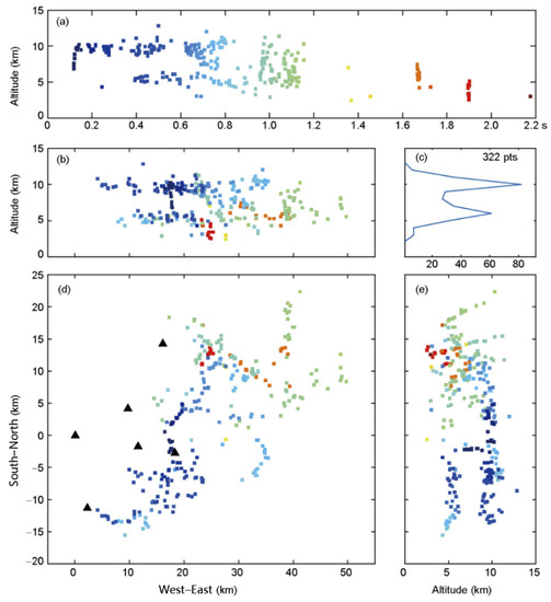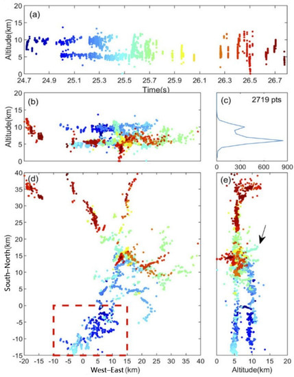 Positioning result based on encoding features for the example in Figure 2. (a) Height-time plots. (b) North-south vertical projection. (c) Height distribution of radiation events. (d) Plan view. (e) East-west vertical projection of lightning radiation sources. Reproduced with permission from the author of Jingxuan Wang, Remote Sens. [36].