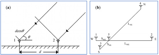 Schematic diagram of the narrowband interferometer (a) and the layout of the five antenna narrowband interferometer (b). Reproduced with permission from the author of Guangshu Zhang, Chin. Sci. Ser. D. [38].