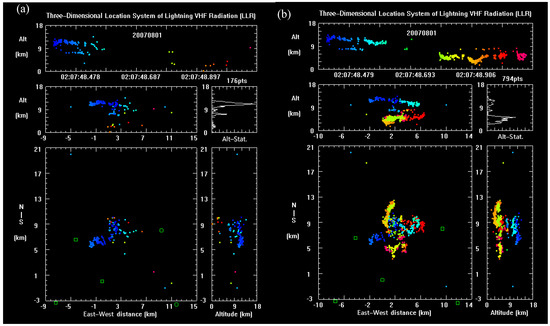 Comparison of the location results of the LLR before (a) and after (b) correction for a cloud-to-cloud (CC) flash. Reproduced with permission from the author of Xianhui Wang, Plateau Meteorol. [54].