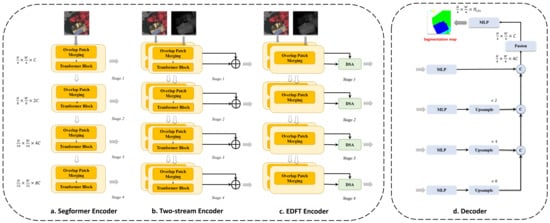 Input image sizes of H × W × 3 (or 1) are embedded to feature sizes of after the first overlapped patch merging module, where C is the embedding dimension. Take an input feature size of h × w × c, for example: The other three overlapped patch-merging modules output a feature size of . The word “overlap” represents the odd kernel size of the convolution, and it helps the transformer consider local information. The encoder in Figure 1a and the decoder in Figure 1d form the Segformer network.