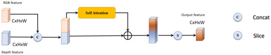 where C is the input color feature, and D is the input depth feature. SA is the abbreviation of self-attention depicted in Section 3.2.1, and it equals to Equations (1) and (2).