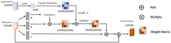 To obtain the depth difference between two pixels from a depth feature of size h × w × c, global average pooling (GAP) operation [36] along channel dimension is used to restore depth features to size of h × w × 1. Then, the feature is reshaped to an n × 1 vector, and copied n times to expand into an n × n matrix . These processes ensure that depth similarity measurement could be depicted in matrix format, which is vital for acceleration. Depth-aware self-attention in an addition mode is illustrated as Figure 3 and computed as: