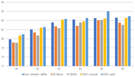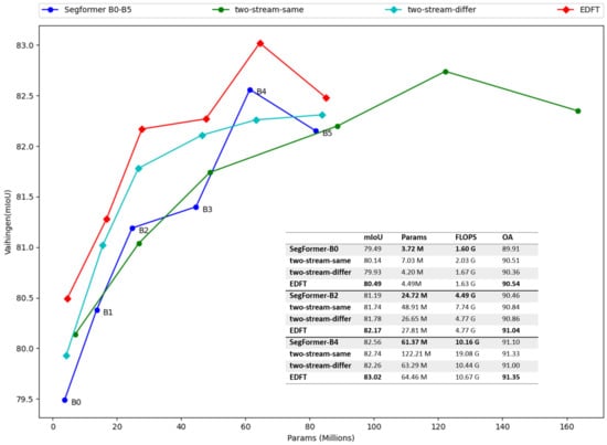 To verify the universality and efficiency, the baseline models of different sizes (from B0 to B5) are adapted according to the proposed method presented in this paper and measured by Params, GFlops, and other accuracy metrics. The results are shown in Figure 4. As shown in the figure, “two-stream-differ” and EDFT network using only the downsampling module can only increase the computational cost and the number of parameters by a fixed small value, unlike the “two-stream-same”, which increases by nearly two times. On the whole, the accuracy of the “two-stream-differ” is higher than that of the baseline method and lower than that of the “two-stream-same”, but in some cases, the results are the opposite (B2 is higher than that of the “two-stream-same”, and B4 is lower than that of the baseline method).
