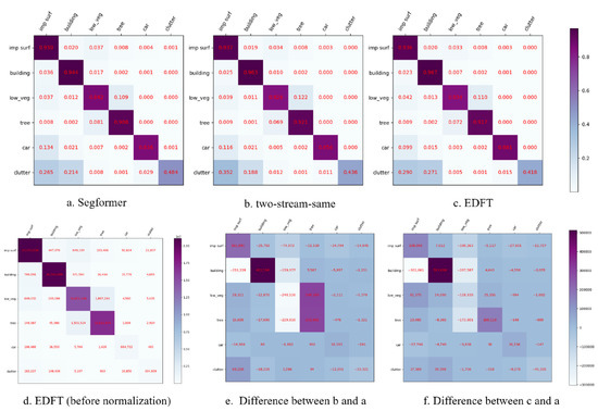 Visualization results of confusion matrices on Vaihingen test set. The top row displays three compared models (Segformer, “two-stream-same”, EDFT), and the model size is B0. The bottom left is the confusion matrix of EDFT without normalization. To make it easier to compare, we visualize the difference between the confusion matrix of Segformer and the one of the other two models (bottom middle and right).