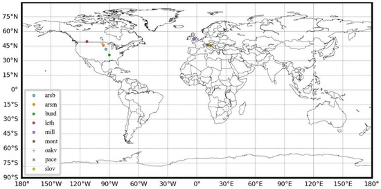 Near-surface digital repeat photography is an important data source for vegetation monitoring, and can also provide an assessment of phenological information obtained from satellite data [40,41]. The PhenoCam tracks vegetation status every 30 min from dawn to dusk using digital photographs [42] (https://phenocam.sr.unh.edu/webcam/, accessed on 10 February 2022). To ensure the reliability of the conclusions, we monitored different vegetation types across various climatic regions. The in situ measurements were collected from nine PhenoCam sites with different climate and vegetation types (Table 1), and the spatial distribution of in situ sites is shown in Figure 1. Digital photographs were used to provide in situ measurements to evaluate satellite-derived vegetation phenological information. The digital images were acquired between 10:00 a.m. and local solar noon from 1 January to 31 December 2020, every day, which was consistent with the acquisition time of the corresponding remote-sensing data in situ.