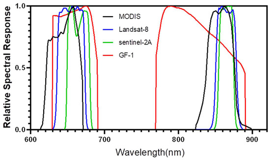 The differences in the observations of different sensors that arise from different RSRs need to be considered. Even for wavelengths designed to have similar coverage, the spectral reflectance can be substantially different because of the RSR [51]. Thus, the sensor signal difference arising from the RSR difference must be considered. As shown in Figure 1, the GF-1 WFV has a broad spectral coverage among the red and NIR bands when compared with the other sensors, and has a significant variation in RSR, especially in the NIR band. Thus, spectral matching should be conducted to mitigate the differences in RSRs. The reflectance for an object in a certain band can be estimated using:
