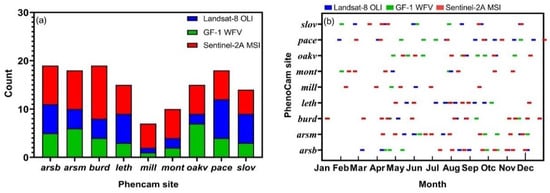 Count of effective observations (a) and the DOY (b) of Landsat-8 OLI, Sentinel-2 MSI, and GF-1 WFV at nine PhenoCam sites. The red is Sentinel-2 MSI, the blue is Landsat-8 OLI, and the green is GF-1 WFV. The name of the site is abbreviated corresponding to the name in Table 1.