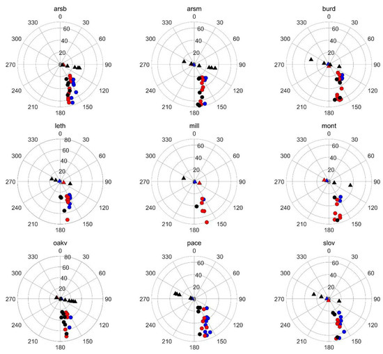 Illumination-viewing geometries of different satellite data used in this study. The triangles represent the location of the sensor, and the circles represent the location of the sun. The blue represents Landsat-8 OLI, the red represents Sentinel-2 MSI, and the black represents GF-1 WFV.