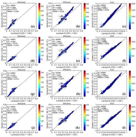 As shown in Figure 6, the RMSE of the red band reflectance between Sentinel-2A MSI and Landsat-8 OLI decreased by 37.5% while the NIR band decreased by 22.7% after BRDF correction. The RMSE of the red band reflectance between GF-1 WFV and Landsat-8 OLI decreased by 31.3%, while the NIR band decreased by 51.6% after BRDF correction. Moreover, the RMSE of EVI2 between Sentinel-2A MSI and Landsat-8 OLI decreased by 47.6% while the GF-1 WFV dropped by 60.3% after BRDF correction. The improvement of Sentinel-2A MSI was not as obvious as that of GF-1, and the improvement of EVI2 was better than that of reflectance. Therefore, as shown in Figure 6, the data harmonization method proposed in this study can help improve the consistency between the high-spatial-resolution data and can eliminate the inconsistency in VI caused by the huge difference in illumination-viewing geometries.