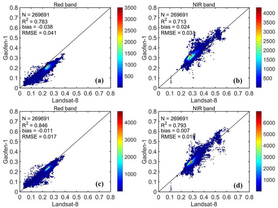 To demonstrate the contribution of harmonization to data fusion, we randomly selected a scene of GF-1 WFV data and compared the fused GF-1 reflectance with and without data harmonization to Landsat-8 OLI data. The difference in data acquisition time between GF-1 and Landsat-8 was 4 days, allowing an assumption of no change to the ground. It can be seen from Figure 8 that the R2 of the red and NIR bands are improved by 8.0% and 11.2%, respectively, the bias decreased by 71.1% and 70.8%, and the RMSE decreased by 58.5% and 41.9%, respectively. By inputting the harmonized data into STARFM, the output results on the predicted date could be improved compared with the true reflectance of the predicted date. The improvement of the NIR band was higher than that of the red band. Data harmonization improved the consistency of the fusion result.