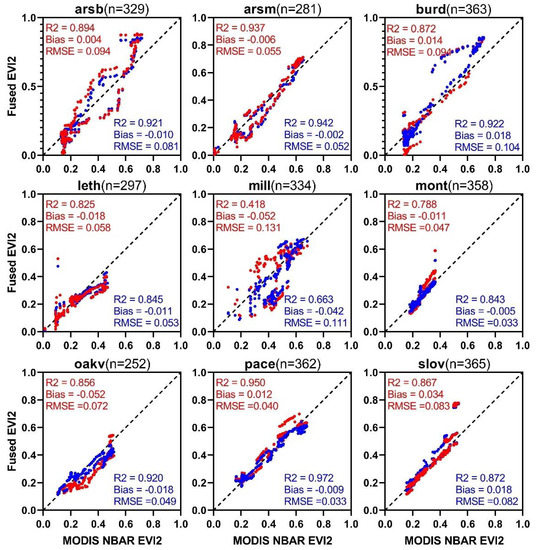 To explore whether data harmonization is beneficial for the consistency of the EVI2 curve calculated by the output of STARFM, the high-spatial-resolution data (Landsat-8 OLI, Sentinel-2A MSI, and GF-1 WFV) and the harmonized data were fused with MODIS NBAR to generate two different time-series EVI2 curves. Meanwhile, we calculated the standard time-series EVI2 using the MODIS EVI2 data. As the missing values of the original MODIS NBAR will cause the missing of fusion results, we chose the fusion results of the nine PhenoCam sites to obtain the time-series EVI2 curve in 2020, and the two different types of time-series EVI2 were compared to the MODIS NBAR EVI2 curve. The results are presented in Figure 9. As shown in Figure 9, the R2 of the EVI2 time-series increased by 6.7%, the bias decreased by 18.7%, and the RMSE decreased by 11.3%. Therefore, with the input of the harmonized high-spatial-resolution data, the consistency of the EVI2 curves is improved. Moreover, specific to different vegetation types, the decrease in bias and RMSE of cropland was 50.0% and 2.5%, respectively, and the improvement in R2 was 3.0%. The decrease in bias and RMSE of grassland was 58.6% and 21.5%, respectively, and the improvement in R2 was 5.0%. As for the deciduous forest, the decrease in bias and RMSE was 123.5% and 10.8%, respectively, and the improvement in R2 was 14.0%. The improvement of the statistical indicators reveals that the consistency of the EVI2 curves was improved with the input of the harmonized data, and this is especially obvious in deciduous forests.
