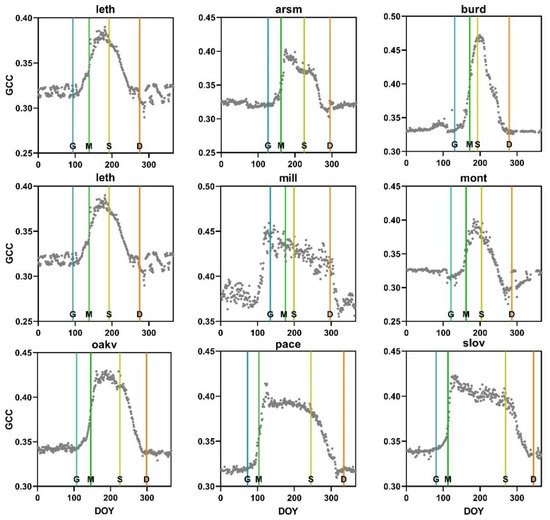 Phenological extraction results of the 9 PhenoCam sites. The gray points are daily in situ GCC. The vertical lines are the transition dates. The letters on the vertical lines are G: greenup; M: maturity; S: senescence; D: dormancy.