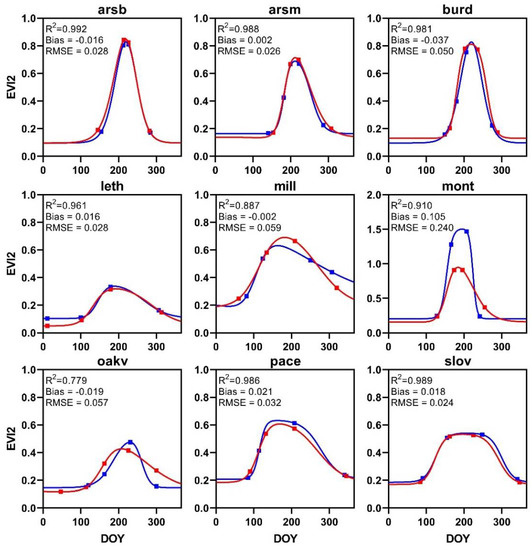 Filtered EVI2 curve and the transition date of the nine PhenoCam sites. The red and blue lines are the filtered EVI2 curves derived by the fused data without and with data harmonization, respectively. The red and blue squares are the vegetation transition dates derived by the corresponding EVI2 curves.